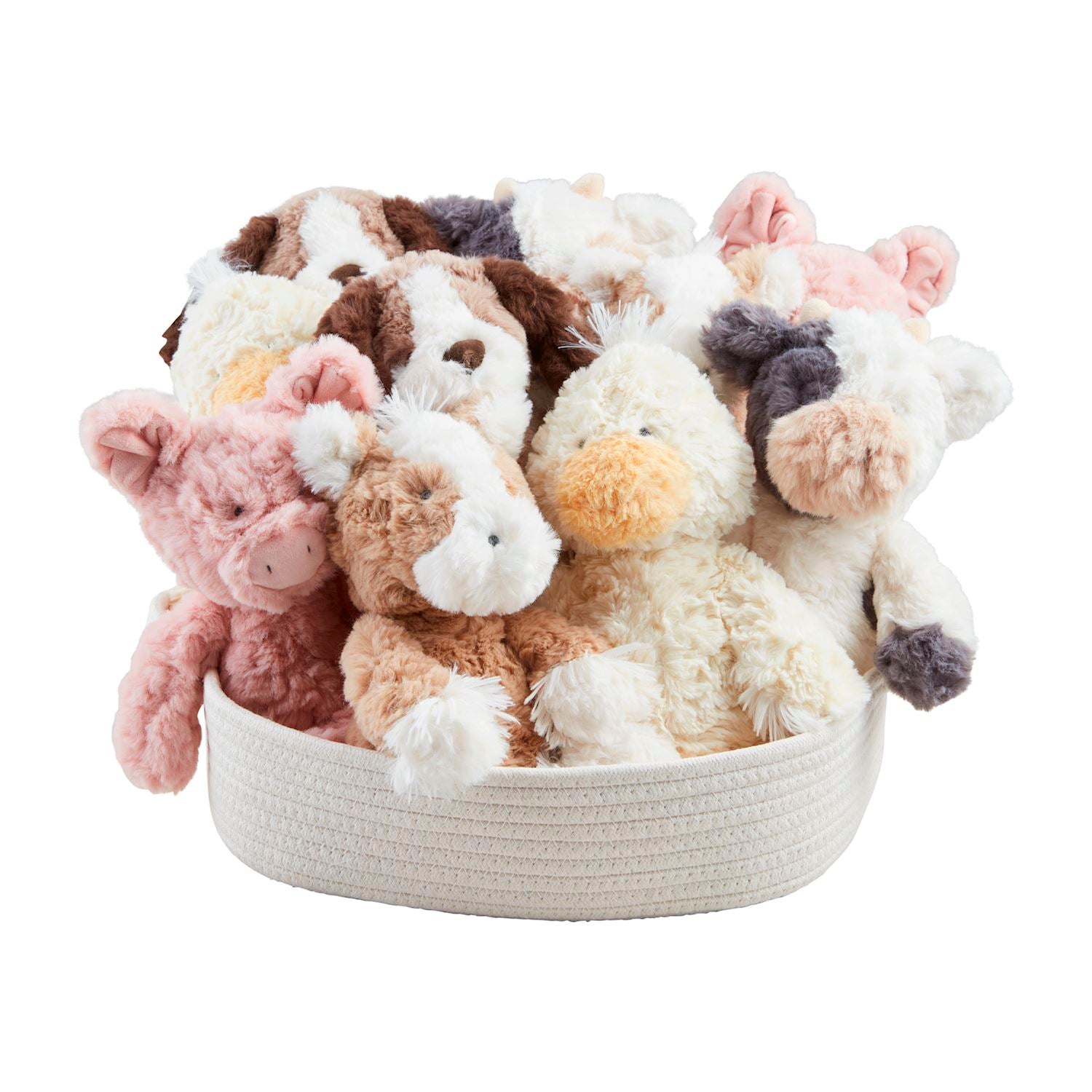 Faux fur plush with weighted seat for sitting. Comes in cotton rope display basket. Dimension: 12"